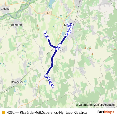 Bus 4262 - Kisvárda-Rétközberencs-Nyírtass-Kisvárda in Kisvarda: Stops & Timetable