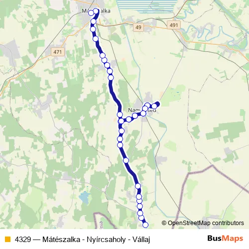 The first stop of the 4329 bus route is Vállaj, újtelep and the last stop is Mátészalka, autóbusz-állomás. 4329 (Mátészalka - Nyírcsaholy - Vállaj) is operational during minden nap.