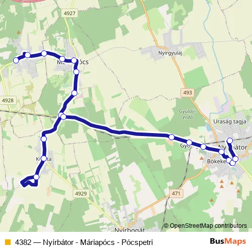 The first stop of the 4382 bus route is Pócspetri, autóbusz-forduló and the last stop is Nyírbátor, vasútállomás. 4382 (Nyírbátor - Máriapócs - Pócspetri) is operational during minden nap.