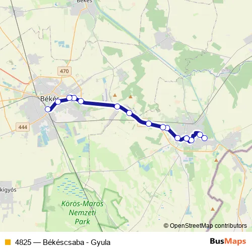 The first stop of the 4825 bus route is Gyula, Reuma szakrendelés and the last stop is Békéscsaba, autóbusz-állomás. 4825 (Békéscsaba - Gyula) is operational during minden nap.