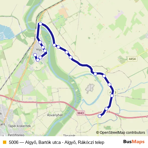 The first stop of the 5006 bus route is Algyő, Bartók utca and the last stop is Algyő, Rákóczi telep. 5006 (Algyő, Bartók utca - Algyő, Rákóczi telep) is operational during hétköznapokon.