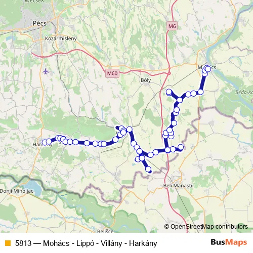 Click here to view the nearest 5813 - Mohács - Lippó - Villány - Harkány bus stop.