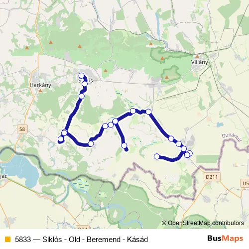 The first stop of the 5833 bus route is Siklós, autóbusz-állomás and the last stop is Kásád, forduló. 5833 (Siklós - Old - Beremend - Kásád) is operational during minden nap.