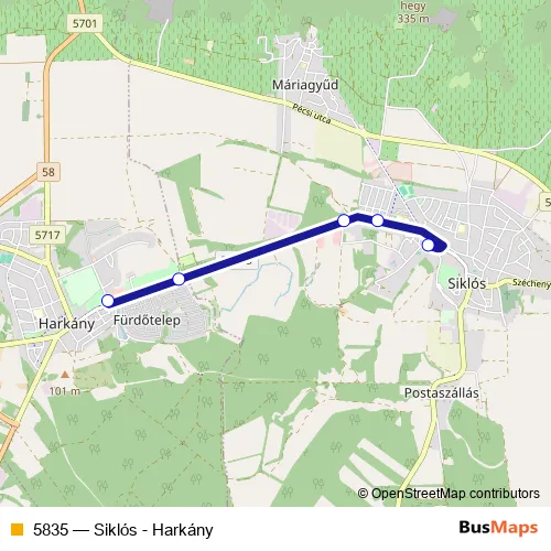 The first stop of the 5835 bus route is Siklós, autóbusz-állomás and the last stop is Harkány, autóbusz-állomás. 5835 (Siklós - Harkány) is operational during minden nap.