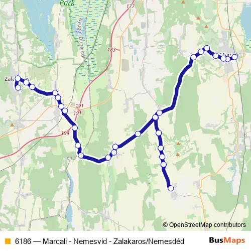 The first stop of the 6186 bus route is Marcali, autóbusz-állomás and the last stop is Zalakaros, autóbusz-állomás. 6186 (Marcali - Nemesvid - Zalakaros/Nemesdéd) is operational during minden nap.