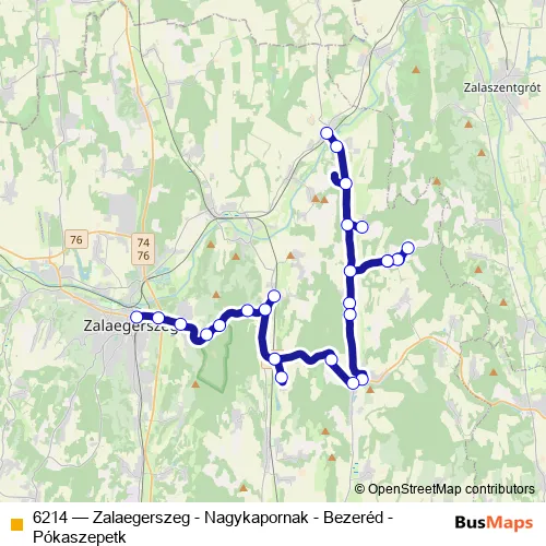 The first stop of the 6214 bus route is Pókaszepetk, posta and the last stop is Zalaegerszeg, autóbusz-állomás. 6214 (Zalaegerszeg - Nagykapornak - Bezeréd - Pókaszepetk) is operational during minden nap.