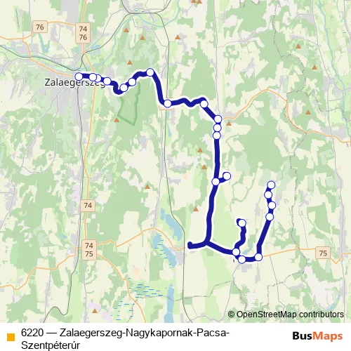 The first stop of the 6220 bus route is Szentpéterúr (Nemesszer), autóbusz-forduló and the last stop is Zalaegerszeg, autóbusz-állomás. 6220 (Zalaegerszeg-Nagykapornak-Pacsa-Szentpéterúr) is operational during minden nap.