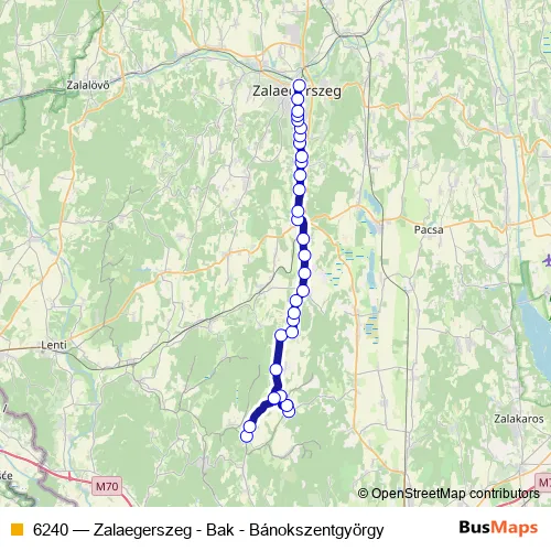 The first stop of the 6240 bus route is Szentliszló, bucsutai elágazás and the last stop is Zalaegerszeg, autóbusz-állomás. 6240 (Zalaegerszeg - Bak - Bánokszentgyörgy) is operational during minden nap.