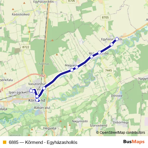 The first stop of the 6885 bus route is Egyházashollós, autóbusz-forduló and the last stop is Körmend, autóbusz-állomás. 6885 (Körmend - Egyházashollós) is operational during hétköznapokon.
