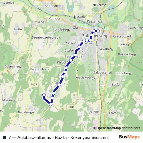 The first stop of the 7 bus route is Zalaegerszeg, autóbusz-állomás and the last stop is Babosdöbréte (Kökényesmindszent), autóbusz-forduló. 7 (Autóbusz-állomás - Bazita - Kökényesmindszent) is operational during minden nap.