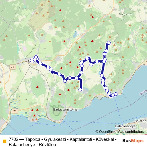 The first stop of the 7702 bus route is Révfülöp, vasútállomás and the last stop is Tapolca, autóbusz-állomás. 7702 (Tapolca - Gyulakeszi - Káptalantóti - Köveskál - Balatonhenye - Révfülöp) is operational during hétvégén.