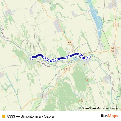 The first stop of the 8333 bus route is Ozora, községháza and the last stop is Simontornya, autóbusz-váróterem. 8333 (Simontornya - Ozora) is operational during minden nap.