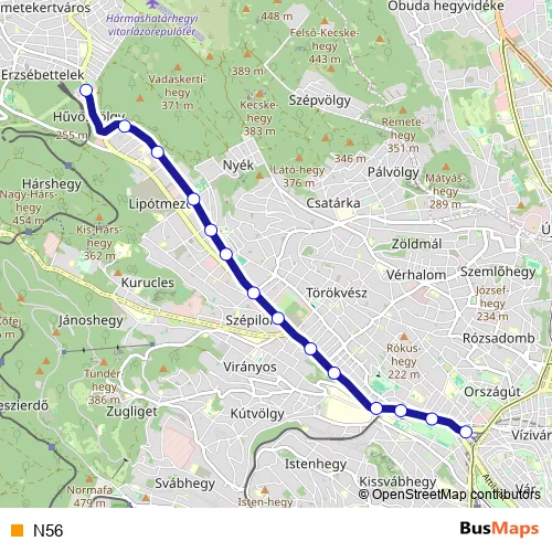 The first stop of the N56 tram route is Széll Kálmán tér M and the last stop is Hűvösvölgy. N56 is operational during minden nap.