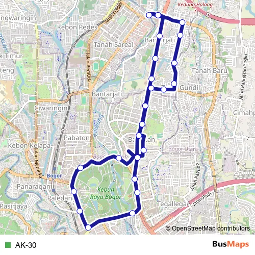 The first stop of the AK-30 bus route is Plaza Jambu Dua and the last stop is Ujung Rute 08A/23 Pangkalan Ojek. AK-30 is operational during setiap hari.