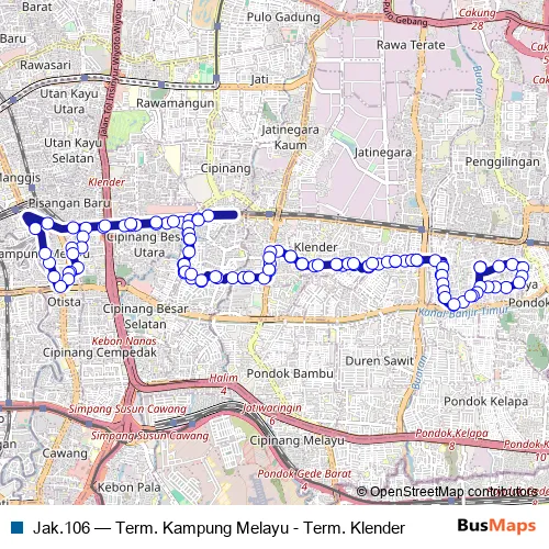 The first stop of the Jak.106 bus route is Term. Klender and the last stop is Term. Klender. Jak.106 (Term. Kampung Melayu - Term. Klender) is operational during setiap hari.