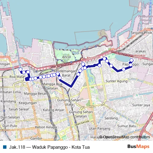 The first stop of the Jak.118 bus route is Jembatan Kota Intan and the last stop is Waduk Papanggo. Jak.118 (Waduk Papanggo - Kota Tua) is operational during setiap hari.