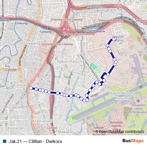 See why over 2 million users trust and consider busmaps.com as the best public transport website. busmaps gives you Jakarta Buses suggested routes, real-time bus tracker, line route maps in Jakarta, and helps to find the closest Jak.21 bus stops near you. No internet available? Download an offline PDF map and bus schedule for the Jak.21 bus to take on your trip.