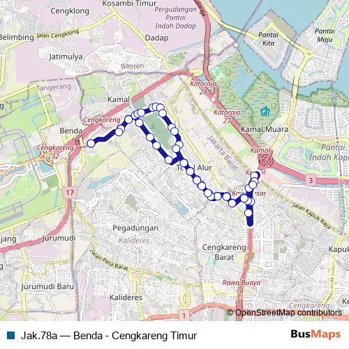 The first stop of the Jak.78a bus route is Cengkareng Business Center and the last stop is Cengkareng Business Center. Jak.78a (Benda - Cengkareng Timur) is operational during setiap hari.