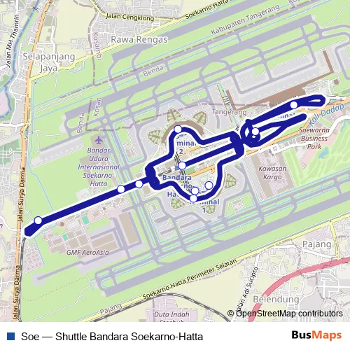 The first stop of the Soe bus route is Tod and the last stop is Tod. Soe (Shuttle Bandara Soekarno-Hatta) is operational during setiap hari.