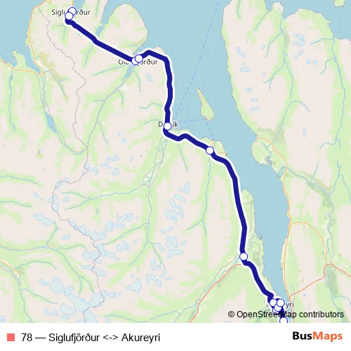 The first stop of the 78 bus route is Siglufjörður - Olís and the last stop is Akureyrarflugvöllur. 78 (Siglufjörður <-> Akureyri) is operational during á hverjum degi.