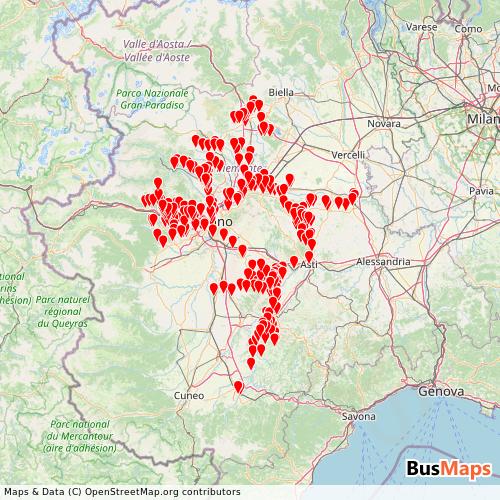 GTT S.p.A. operates in the following cities: Avigliana, Chivasso, Ivrea, Orbassano, Turin, Alba, Canale, Casale Monferrato, Caselette, Cisterna d'Asti, Favria, Grinzane Cavour, Grugliasco, Monteu Roero, Oglianico, San Maurizio, Trana, Vestigne, Villadeati.