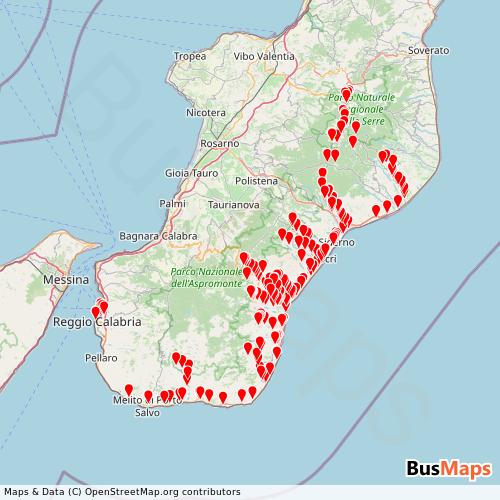 Mediterraneabus S.P.A. operates in the following cities: Careri, Bovalino, Gioiosa Ionica, Reggio Calabria, San Luca, Antonimina, Benestare, Ferruzzano, Gerace, Locri, Mongiana, Natile Nuovo, Placanica, Portigliola, Serra San Bruno, Siderno.
