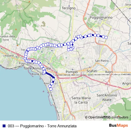 The first stop of the 003 bus route is Boscoreale - Via Cangiani, Marra and the last stop is Torre Annunziata - Via Provinciale Schito, Ciba. 003 (Poggiomarino - Torre Annunziata) is operational during tutti i giorni.