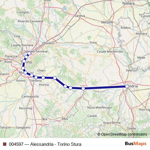 The first stop of the 004597 rail route is Alessandria F.S. and the last stop is Torino Stura F.S.. 004597 (Alessandria - Torino Stura) is operational during tutti i giorni.