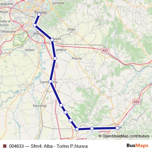 The first stop of the 004633 rail route is Alba F.S. and the last stop is Torino Porta Nuova F.S.. 004633 (Sfm4: Alba - Torino P.Nuova) is operational during nei giorni feriali.
