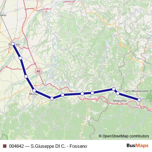The first stop of the 004642 rail route is SAN Giuseppe DI Cairo F.S. and the last stop is Fossano F.S.. 004642 (S.Giuseppe DI C. - Fossano) is operational during tutti i giorni.