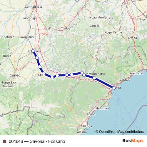 The first stop of the 004646 rail route is Savona F.S. and the last stop is Fossano F.S.. 004646 (Savona - Fossano) is operational during tutti i giorni.