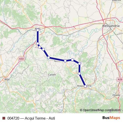 The first stop of the 004720 rail route is Acqui Terme F.S. and the last stop is Asti F.S.. 004720 (Acqui Terme - Asti) is operational during tutti i giorni.