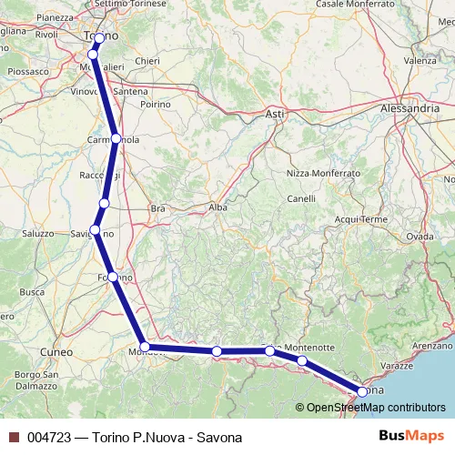 The first stop of the 004723 rail route is Torino Porta Nuova F.S. and the last stop is Savona F.S.. 004723 (Torino P.Nuova - Savona) is operational during tutti i giorni.