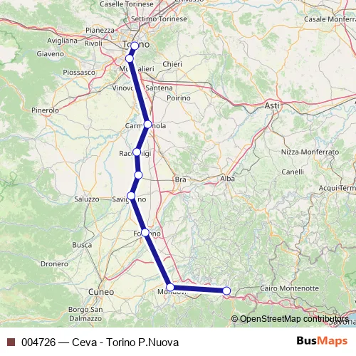 The first stop of the 004726 rail route is Ceva F.S. and the last stop is Torino Porta Nuova F.S.. 004726 (Ceva - Torino P.Nuova) is operational during tutti i giorni.