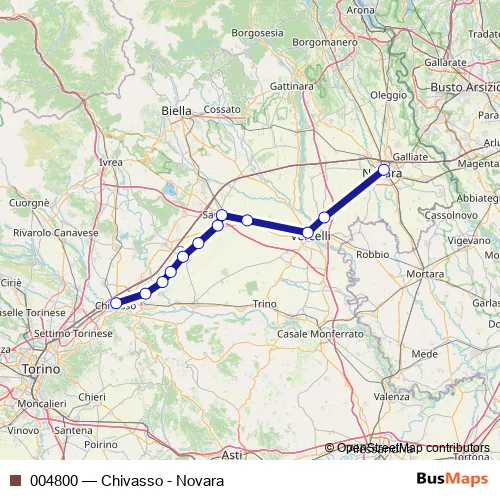 The first stop of the 004800 rail route is Chivasso F.S. and the last stop is Novara F.S.. 004800 (Chivasso - Novara) is operational during tutti i giorni.