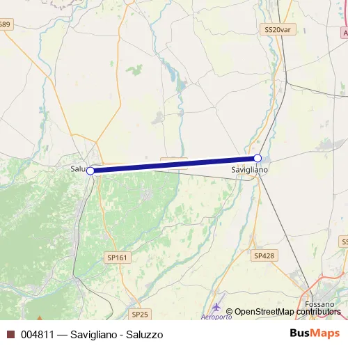 The first stop of the 004811 rail route is Savigliano F.S. and the last stop is Saluzzo F.S.. 004811 (Savigliano - Saluzzo) is operational during nei giorni feriali.