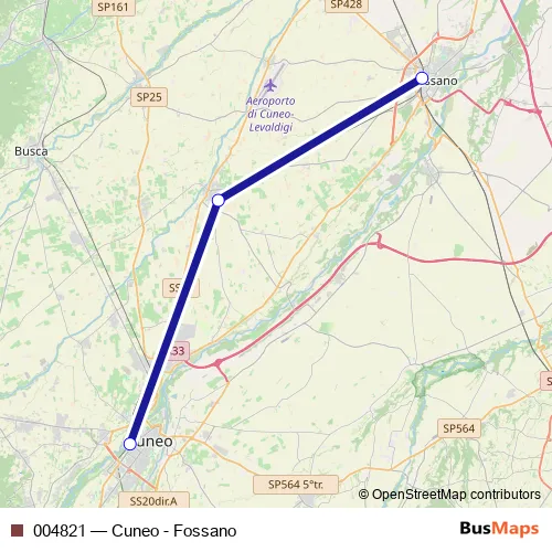 The first stop of the 004821 rail route is Cuneo F.S. and the last stop is Fossano F.S.. 004821 (Cuneo - Fossano) is operational during tutti i giorni.
