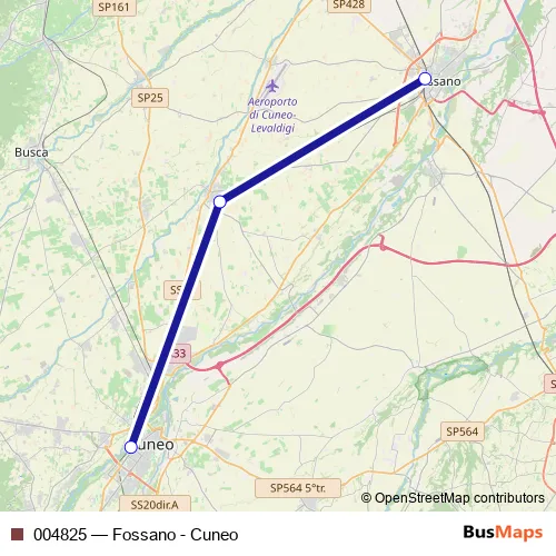 The first stop of the 004825 rail route is Fossano F.S. and the last stop is Cuneo F.S.. 004825 (Fossano - Cuneo) is operational during tutti i giorni.