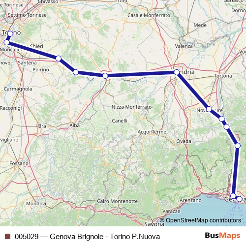 The first stop of the 005029 rail route is Genova Brignole F.S. and the last stop is Torino Porta Nuova F.S.. 005029 (Genova Brignole - Torino P.Nuova) is operational during tutti i giorni.