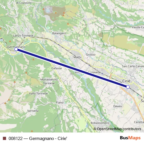 The first stop of the 008122 rail route is Germagnano F.S. and the last stop is Cirie' F.S.. 008122 (Germagnano - Cirie') is operational during tutti i giorni.