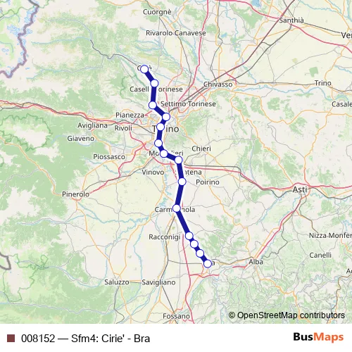 The first stop of the 008152 rail route is Cirie' F.S. and the last stop is BRA F.S.. 008152 (Sfm4: Cirie' - Bra) is operational during tutti i giorni.