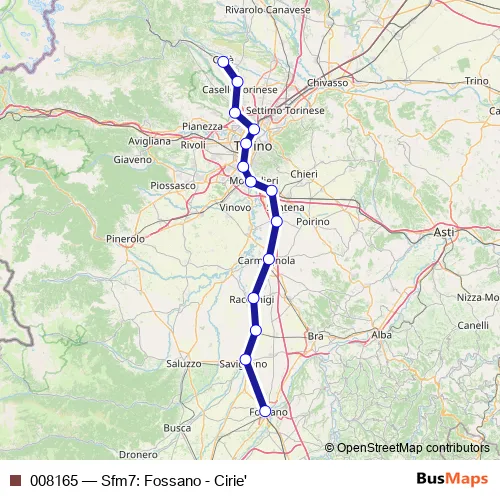 The first stop of the 008165 rail route is Fossano F.S. and the last stop is Cirie' F.S.. 008165 (Sfm7: Fossano - Cirie') is operational during tutti i giorni.