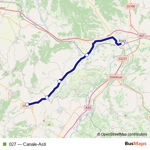 The first stop of the 027 bus route is Canale and the last stop is Asti - Autostazione - Movicentro - Piazzale Medaglie D'Oro. 027 (Canale-Asti) is operational during tutti i giorni.