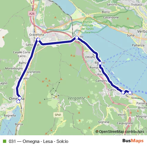 The first stop of the 031 bus route is Omegna - Piazza Beltrami and the last stop is Stresa - Imbarcadero. 031 (Omegna - Lesa - Solcio) is operational during nei giorni feriali.