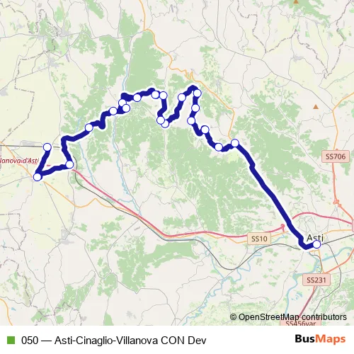 The first stop of the 050 bus route is Asti - Autostazione - Movicentro - Piazzale Medaglie D'Oro and the last stop is Villanova D'Asti - Stazione Ferroviaria. 050 (Asti-Cinaglio-Villanova CON Dev) is operational during tutti i giorni.