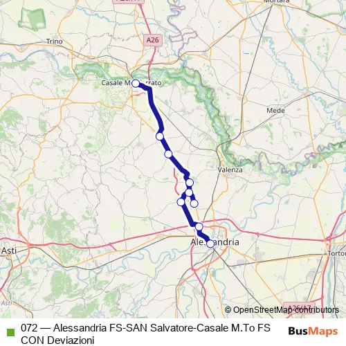 Services on the 072 - Alessandria FS-SAN Salvatore-Casale M.To FS CON Deviazioni bus stop at 19:28 on lunedì, martedì, mercoledì, giovedì, venerdì, sabato.