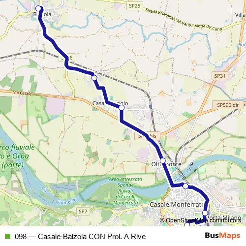 The first stop of the 098 bus route is Balzola - Piazza Genovesio and the last stop is Casale Monferrato - Autostazione. 098 (Casale-Balzola CON Prol. A Rive) is operational during tutti i giorni.
