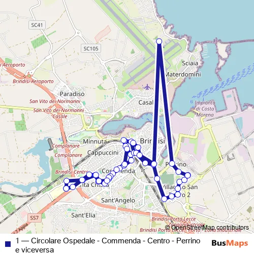 Brindisi - Ospedale Perrino. 1 (Circolare Ospedale - Commenda - Centro - Perrino e viceversa) is operational during tutti i giorni.