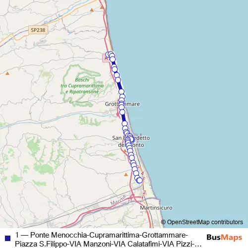 The first stop of the 1 bus route is Ponte Menocchia and the last stop is Porto D'Ascoli - VIA Turati-BAR Sweet Po. 1 (Ponte Menocchia-Cupramarittima-Grottammare-Piazza S.Filippo-VIA Manzoni-VIA Calatafimi-VIA Pizzi-SAN Benedetto DEL Tronto FS-Ss16-VIA Turati) is operational during tutti i giorni.