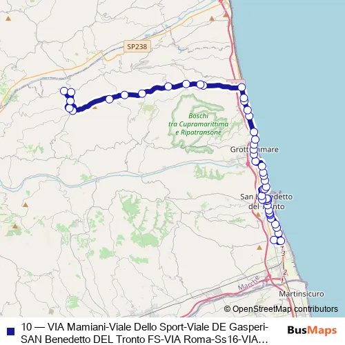 The first stop of the 10 bus route is S. Benedetto DEL TR. - VIA Mamiani Depos and the last stop is Carassai Dir. Montefiore. 10 (VIA Mamiani-Viale Dello Sport-Viale DE Gasperi-SAN Benedetto DEL Tronto FS-VIA Roma-Ss16-VIA Manzoni-Piazza S.Filippo-Ss16-Grottammare-Cupramarittima-VAL Menocchia-Carassai) is operational during tutti i giorni.